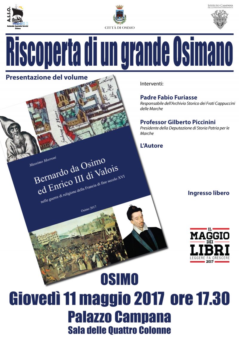 A Osimo per il Maggio dei libri, riscoperta di un grande osimano, Bernardo da Osimo, cappuccino. Vissuto nel primo secolo, egli resse la provincia dei Cappuccini a Parigi. Lo conosceremo attraverso il libro di M. Morroni che verrà presentato giovedì 11 maggio 2017 alle ore 17.30 al Palazzo Campana . I particolari dell’evento nella locandina che pubblichiamo.