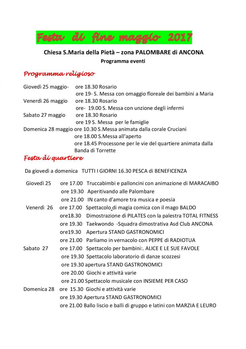 Dal 25 al 28 maggio 2017 festa al quartiere di Palombare con numerose iniziative per tutti i gusti… Il programma religioso, che non si sovrappone ma si affianca, alla festa, prevede, tra l’altro, momenti per i bambini, anziani e famiglie. e culmina con la processione per le vie del quartiere. La festa promuove tutti i giorni oltre alla pesca di beneficenza, varie iniziative di gioco, … Continua a leggere domenica28Maggio 00:00 Festa di fine maggio alle Palombare di Ancona 28/05/2017 00:00 »