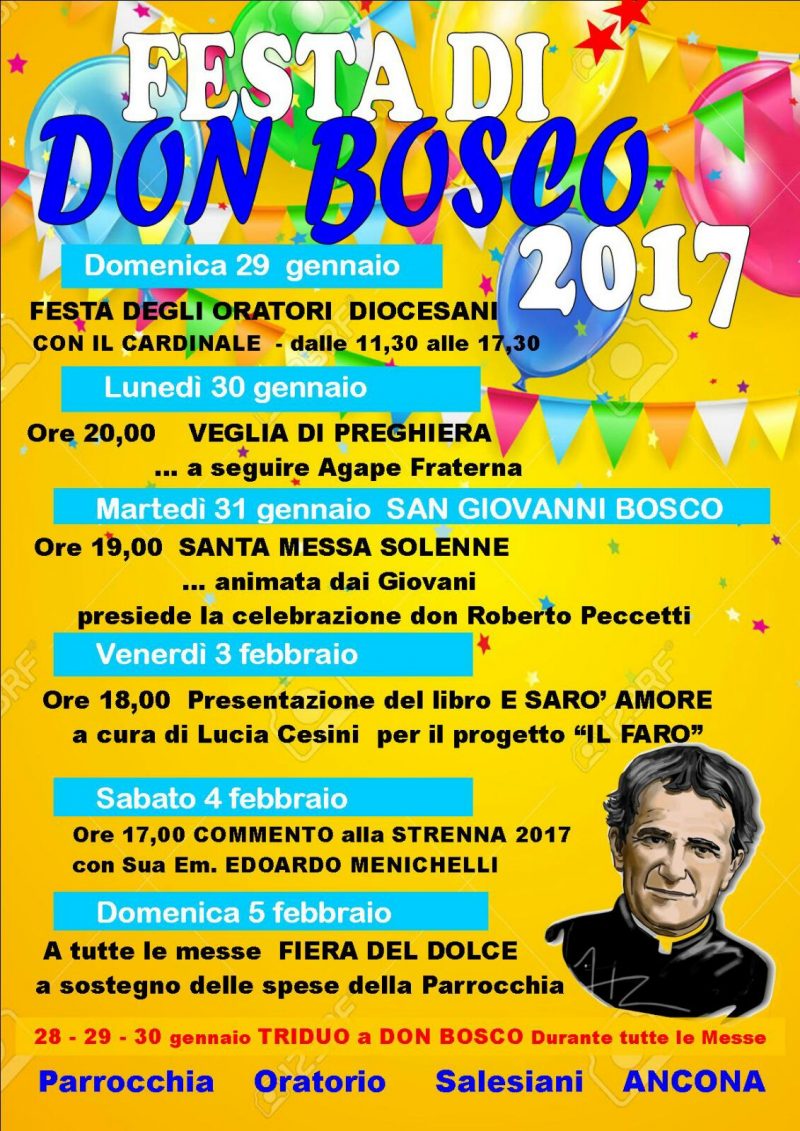 Alla Parrocchia Sacra Famiglia – Salesiani si celebra la festa di don Bosco 2017 con un nutrito programma che inizia il 28 gennaio con il triduo al Santo. Il 29 la festa degli Oratori e così altri appuntamenti fino a domenica 5 febbraio . Tutte le info nel volantino che pubblichiamo.