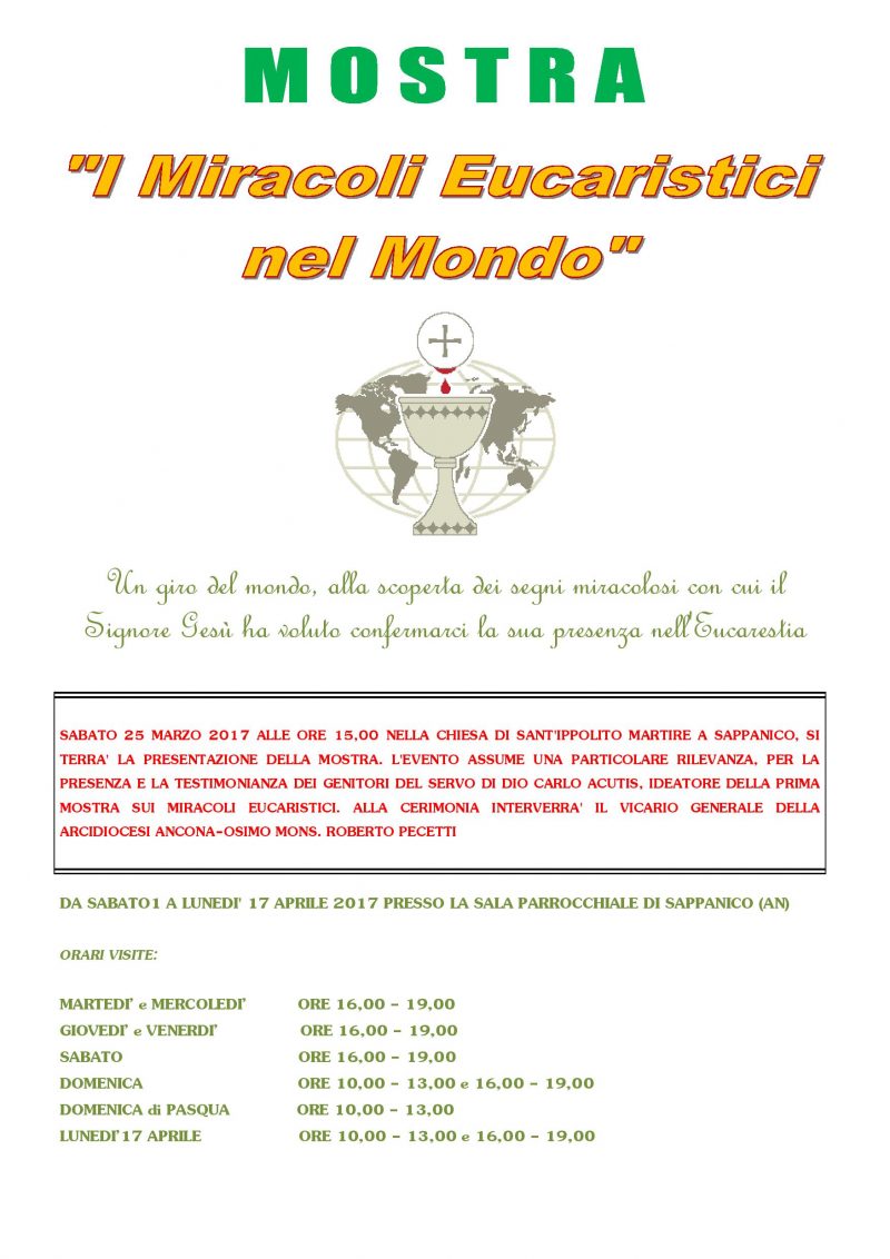 Una interessante mostra sui Miracoli Eucaristici nel mondo sarà inaugurata sabato 25 marzo 2017 alle ore 15 nella parrocchia di S.Ippolito a Sappanico di Ancona nel ricordo di Carlo Acutis giovane “servo di Dio” morto a 15 anni di leucemia, ideatore della prima mostra su questo tema. Saranno presenti i genitori. Le visite da sabato 1 aprile a lunedì 17 aprile secondo i seguenti orari: … Continua a leggere sabato25Marzo 00:00 Inaugurazione della mostra: I miracoli eucaristici nel mondo 25/03/2017 00:00 »