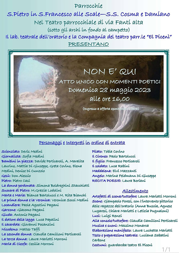 Associazioni e movimenti, Eventi parrocchiali 27 Maggio 2023 matteoneri domenica 28 Maggio 16:00 Non è Qui: Spettacolo TeatraleInizio: 28/05/2023 16:00