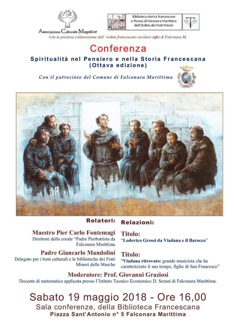 VIII edizione della rassegna “Spiritualità e pensiero nella storia francescana” curata dalla Biblioteca storica francescana dei Frati Minori di Falconara con l’Associazione Magnificat e la collaborazione dell’ordine secolare – ofs. Appuntamento, in chiave musicale, sabato 19 maggio 2018 alle ore 16 presso la sala conferenze della Biblioteca in P. za S.Antonio a Falconara con il maestro Pier Carlo Fontemagi e Padre Giancarlo Mandolini l, relatori … Continua a leggere