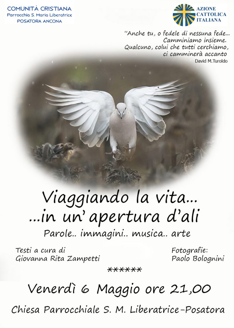 “Anche tu, o fedele di nessuna fede. Camminiamo insieme… Qualcuno, colui che tutti cerchiamo ci camminerà accanto” D.M. Turoldo Il “Viaggio.. in apertura d’ali” utilizza i riflessi della cultura : suggestioni e approfondimenti che parlano altri linguaggi: la musica, la letteratura, la fotografia , la pittura… Quella realtà culturale in cui siamo immersi e che può offrire occasione di incontro e di riflessione attraverso strade aperte … Continua a leggere venerdì6Maggio 00:00 “Viaggiando la vita… in un’apertura d’ali” 06/05/2016 00:00 »