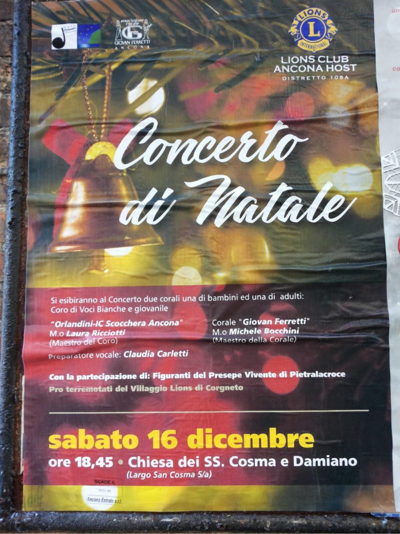 Appena affisso nei muri della città di Ancona, leggiamo il manifesto che annuncia il Concerto di Natale presso la Chiesa di SS. Cosma e Damiano, sabato 16 dicembre 2017, alle ore 18.45. Questo concerto, organizzato dal Lions Club Ancona a favore del Villaggio Lions di Corgneto (MC), prevede la collaborazione e l’esibizione del Coro di voci bianche IC Orlandini- Scocchera, degli adulti della corale Giovan … Continua a leggere sabato16Dicembre 00:00 A SS. Cosma e Damiano concerto natalizio 16/12/2017 00:00 »