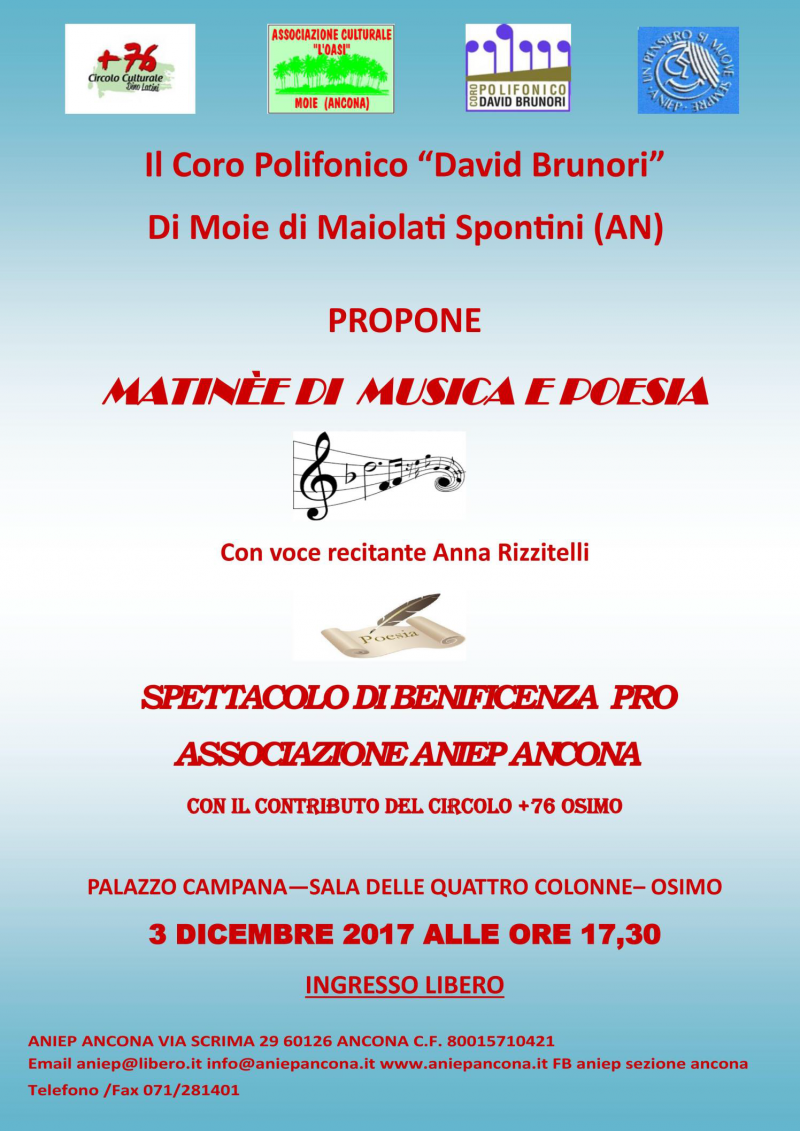 In occasione della giornata mondiale della disabilità, l’ANIEP in collaborazione con diverse Associazioni propone un Matinèe di musica e poesia con il coro polifonico di Moie di Maiolati Spontini e la voce recitante di Anna Rizzitelli. L’evento si svolgerà a palazzo Campana a Osimo il 3 dicembre 2017 alle ore 17,30. Con il volantino con i particolari dell’evento, pubblichiamo il Comunicato Stampa che offre lanciando … Continua a leggere domenica3Dicembre 00:00 Giornata mondiale della disabilità 03/12/2017 00:00 »