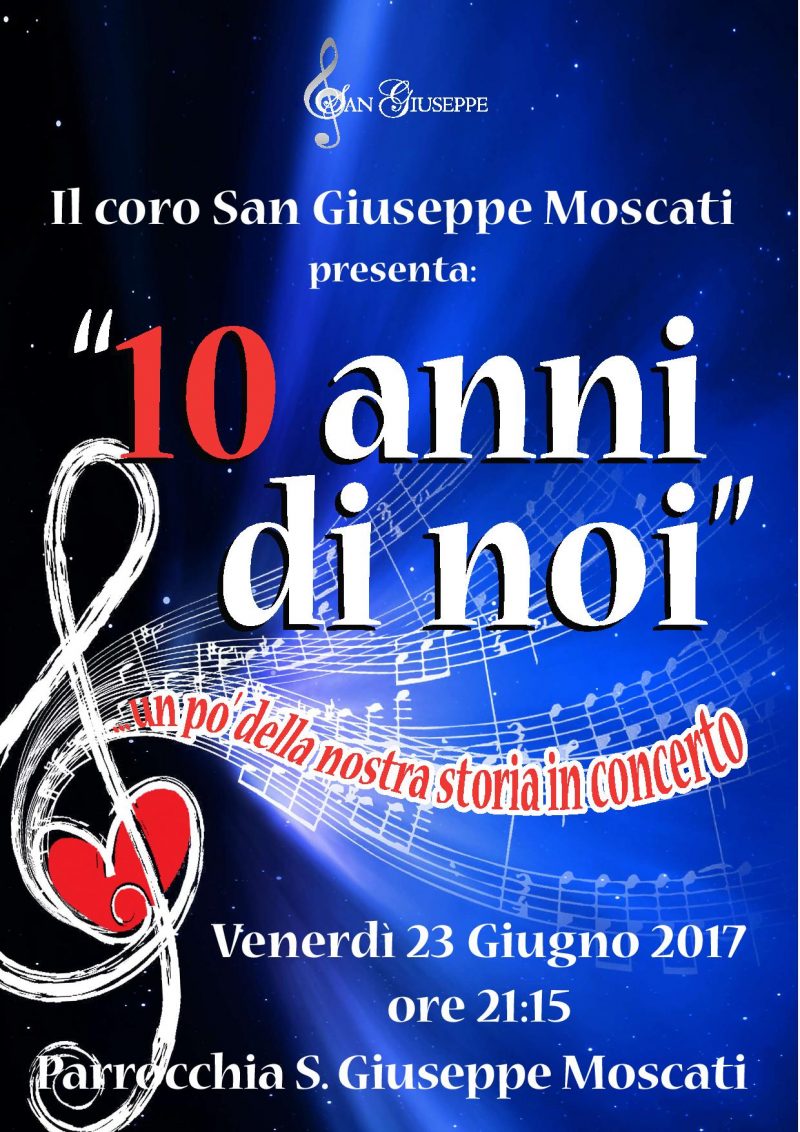 “10 anni di noi” un po’ della nostra storia in concerto, è il titolo dell’evento organizzato venerdì 23 giugno 2017 alle ore 21,15 presso la chiesa parrocchiale di S.Giuseppe Moscati ad Ancona dal coro omonimo che festeggia i 10 anni della sua attività. La direttrice del coro Iosetta Zampa invitando a condividere la festa, ci invia la locandina che pubblichiamo