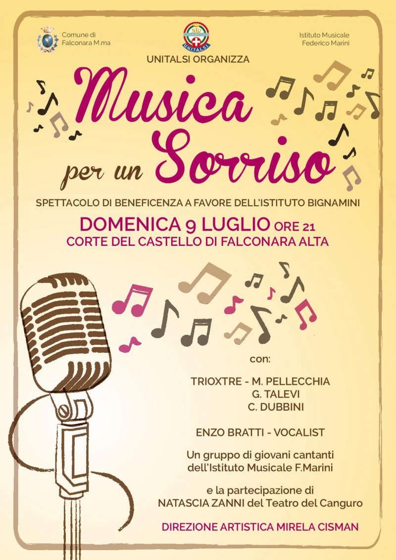 Nella suggestiva cornice del Castello di Falconara Alta, domenica 9 luglio alle ore 21 l’UNITALSI, con il Comune di Falconara M.ma e l’Istituto Musicale Marini, ha organizzato una serata musicale il cui incasso sarà devoluto al’Istituto Bignamini di Falconara Sul palcoscenico una serie di giovani musicisti in divese performances per una piacevole serata. I particolari nella locandina che pubblichiamo