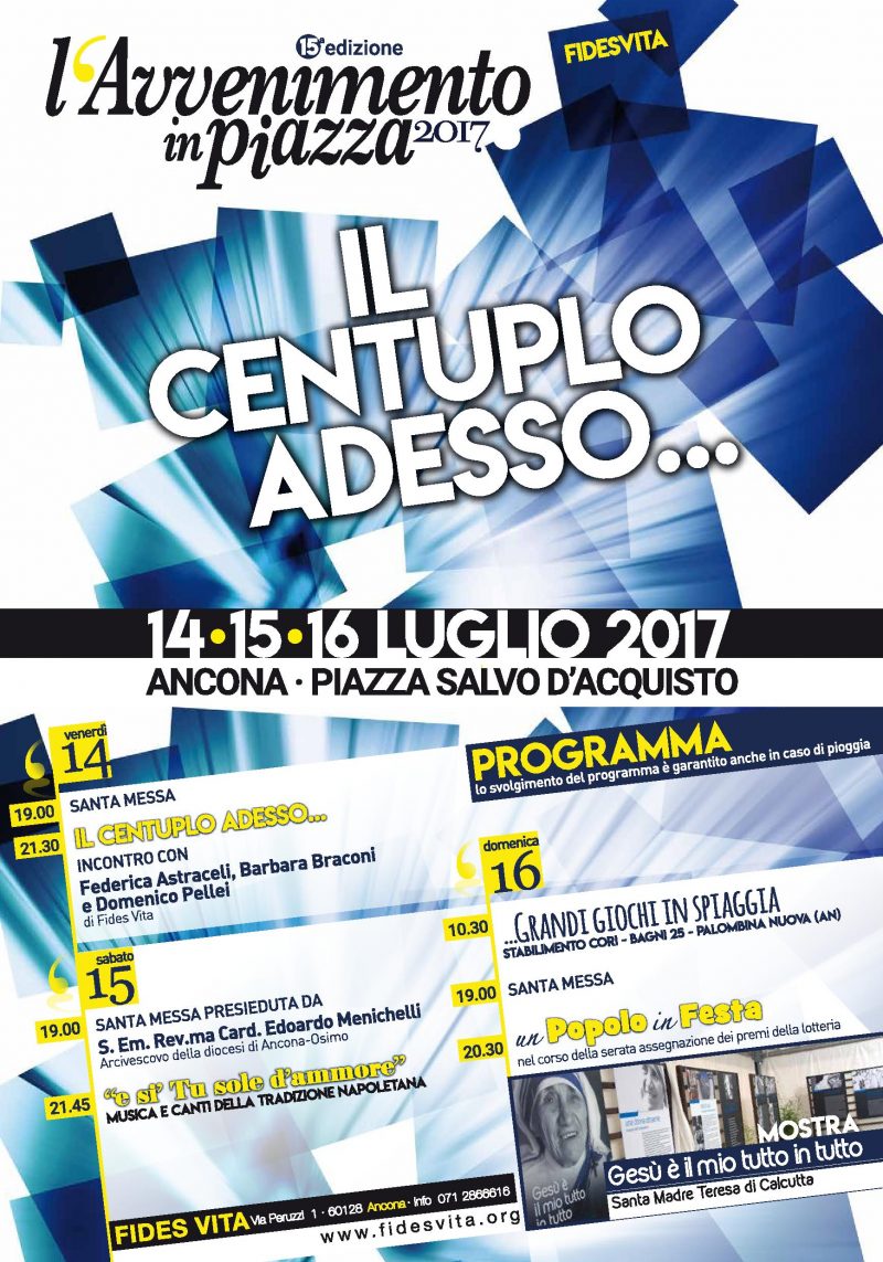 15ma edizione dell’Avvenimento in Piazza, il 14-15-16 luglio 2017 in piazza Salvo D’Acquisto ad Ancona, articolato in diversi momenti culturali musicali e ludici. La celebrazione della S. Messa accompagna le varie giornate. In particolare sabato 15 la celebrazione sarà presieduta dal Card. Menichelli. Orari e particolari degli eventi, nel volantino che pubblichiamo.